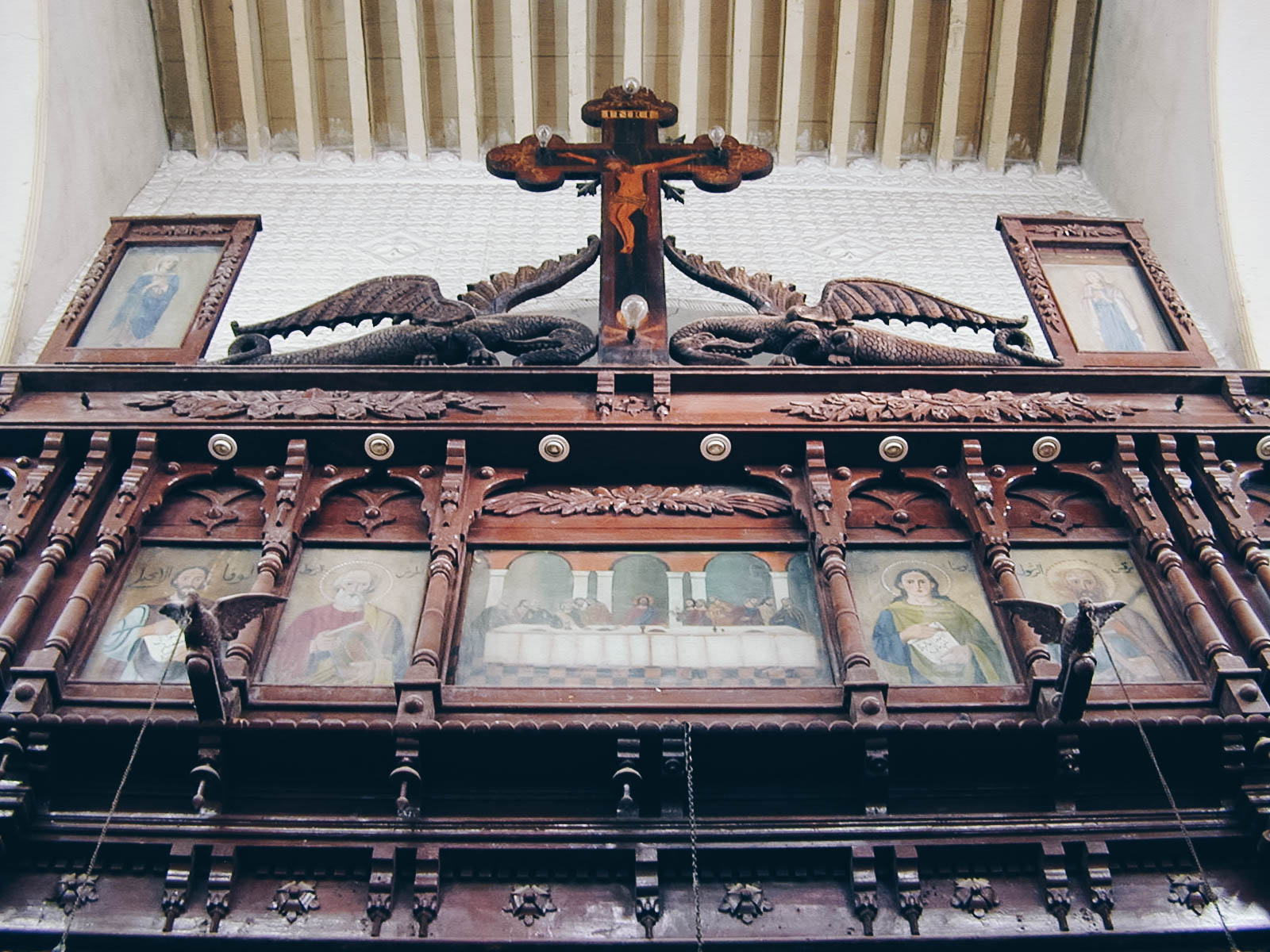 beautiful paintings on the iconostasis of the Church of the Holy Virgin and St. Apa Nub April 12, 2017 1600 × 1200 Samannud Photo: Paul Perry, beautiful paintings on the iconostasis of the Church of the Holy Virgin and St. Apa Nub at Samannud. We can see the big cross, the icons of the Last Supper, and the icons of the four Evangelists on it.