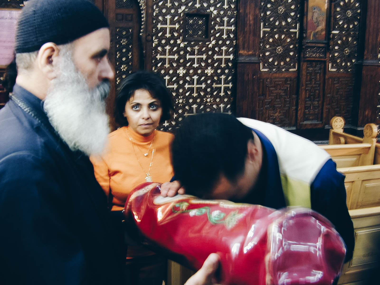 Photo: Paul Perry, a priest carrying the relics of St. Apa Nub at the Church of the Holy Virgin and St. Apa Nub at Samannud. Observe the man who is kissing the relics of the saint so that he can receive his blessings. This is a familiar sight in the Coptic Orthodox Church, following the faith of the woman who had an issue of blood in the Bible who believed in the heavenly power in a mere touch of Jesus’ garment and “said within herself, If I May but touch his garment, I shall be whole” [Matthew 9:20-21].