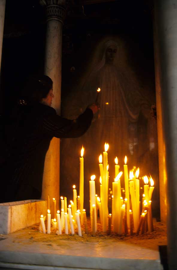 May 21, 2017 591 × 900 Al Zaytun Photo: Norbert Schiller, a woman holds a candle before an icon of the Holy Virgin in the Church of the Holy Virgin at Zaytun.