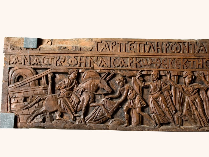 Photo: The Coptic Museum, this exceptional lintel depicts two scenes from the New Testament: The entry of Jesus, as a king, into Jerusalem and the Ascension. In the first scene (on the left) Jesus is entering the city on a donkey. There are three figures opposite of him: one is spreading his cloak before Christ. Another is praising Jesus by waving with a palm-branch and the dancing daughter of Zion (John 12:15) turns her head back to the second scene. Jesus is enthroned in a Mandorla supported by angels in full flight and two animals associated with the evangelists, the ox (Luke) and lion (Mark). Jesus is flanked by Virgin Mary (next to him on the left side) and the apostles. Above these two scenes a hymn in four Greek lines is praising Jesus.