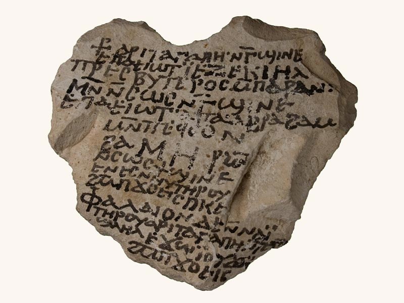 Photo: The Coptic Museum, ostraca are fragmentary pieces of pottery, stone or bone bearing inscriptions or a design. This ostracon shows part of a running horse, its body decorated with motifs and a Coptic word. This limestone ostracon with Coptic script is a letter from Phrangas to the pious priest Peter, asking for news of Peter’s health.