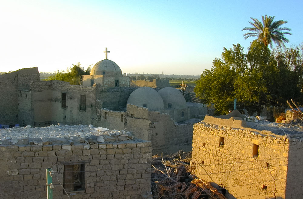 Photo: Paul Perry, a view of the two historical Coptic Orthodox Churches at Dayr al-Maymun located amidst fields and farmers’ houses. To the left is the Church of St. Anthony the Great (251-356) and to the right is the Church of Abu Sefein. In the Church of St. Anthony is the cave where St. Anthony the founder of monasticism, had lived for some 20 years. According to tradition he worshipped in the Church of Abu Sefein.