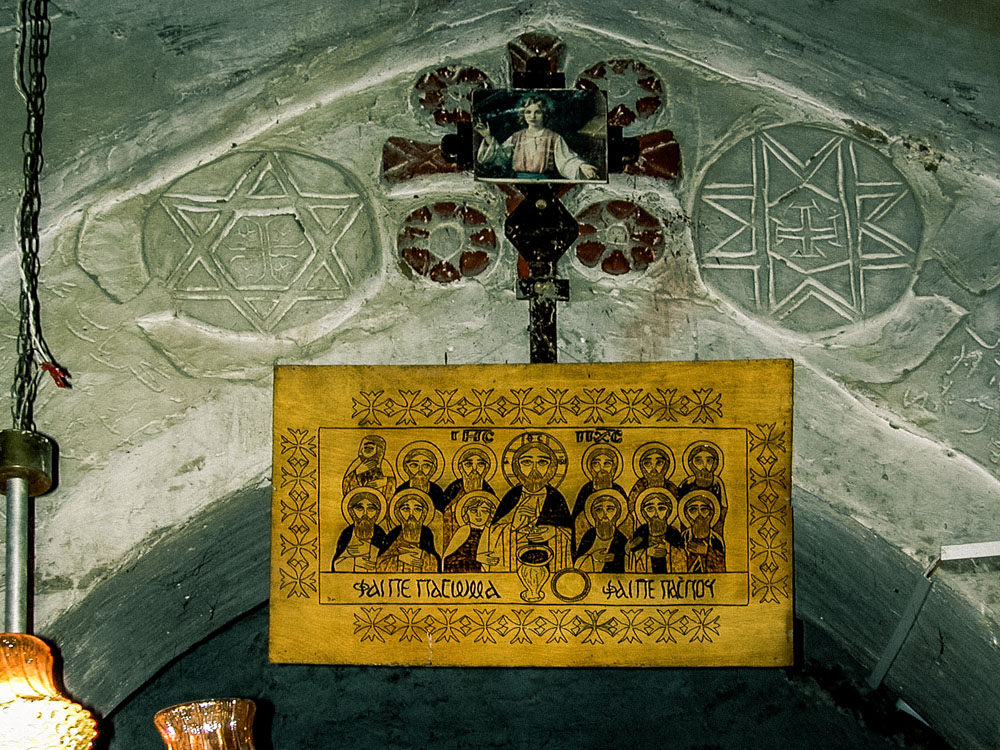 DSCN1308 June 14, 2017 1000 × 750 Dayr Al-Maymun Photo: Paul Perry, a handkerchief of the Last Supper inside the Church of Abu Sefein. Notice the stars of David at the top of the picture. This is probably the only church in Egypt with these stars.