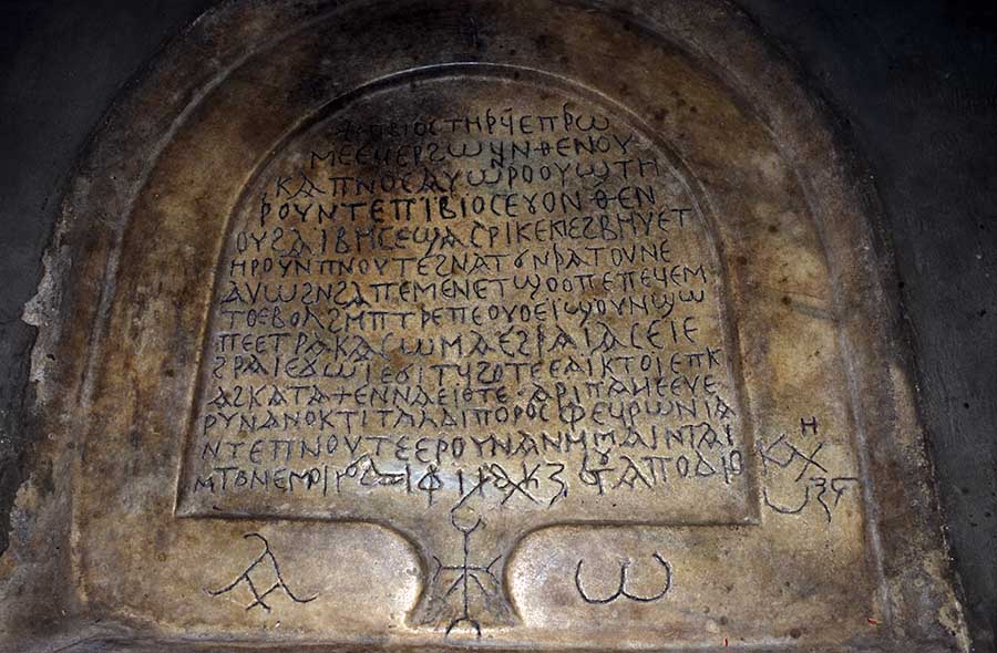 NS_149 June 20, 2017 900 × 590 Dayr Abu Hinnis Photo: Norbert Schiller, an ancient marble altar with Coptic inscriptionsin the Church of St. John the Short at Dayr Abu Hinnis.