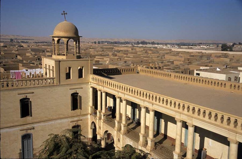 NS_167 July 5, 2017 900 × 592 Dayr al-Muharraq Photo: Norbert Schiller, the section of the monastery that houses the monks’ cells. Laundry can be seen drying on the rooftop.; in the background is a Christian cemetery.