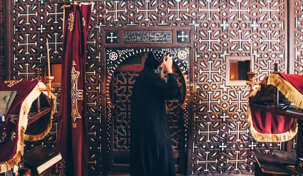 SONY DSC July 6, 2017 1000 × 581 Dayr al-Muharraq Photo: Shangyun Shen, a monk standing in front of the acient iconostasis.